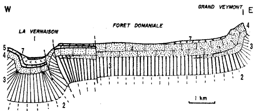 ![]() Coupe simplifiée des plateaux sud-orientaux du Vercors, d'après H. ARNAUD, 1976) 1. Marnes valanginiennes ; 2. Calcaires argileux et marnes de l'Hauterivien ; 3. Calcaires argileux du Barrémien tout-à-fait inférieur ; 4-7 = Barrémien inférieur calcaire, formant falaise : 4. Calcaires lités à petits débris ou à silex ; 5. Calcaires bioclastiques lités ; 6. Calcaires dolomitiques ; 7. Calcaires à Rudistes. |