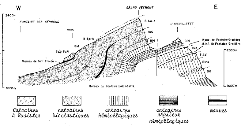 ![]() Coupe plus détaillée du Grand Veymont (extrait de H. ARNAUD 1981) pour plus d'explications sur les annotations stratigraphiques se reporter à la page spéciale |