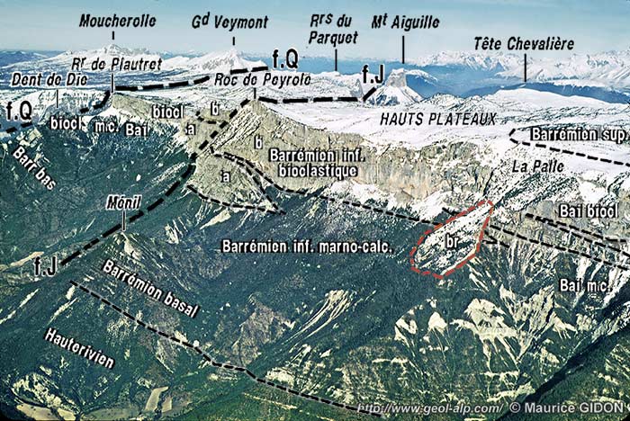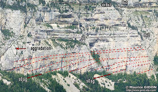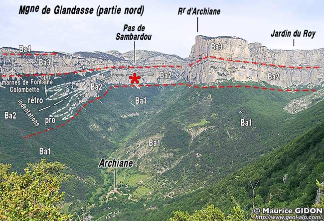 ![]() Le cirque d'Archiane vu du sud-est, depuis le belvédère d'Archiane (alt.1160), atteint par Bénévise. (l'astérisque rouge indique l'emplacement de la partie agrandie au cliché suivant). Ba4 = cycle sédimentaire du Barrémien supérieur ; Ba3, Ba2 et Ba1 = cycles sédimentaires du Barrémien inférieur. (interprétation et nomenclature stratigraphique d'après H.ARNAUD, 2005). Sur cette coupe la tranche de sédiments Ba1 est exclusivement représentée par des faciès hémi-pélagiques (calcaires argileux et marnes) et la tranche Ba3 par des faciès bioclastiques (formation de Glandasse = Urgonien au sens large du terme). La tranche Ba2 montre le passage par intrications entre ces deux types de faciès, d'abord avec progradation vers le sud des faciès bioclastiques, puis avec rétrogradation, les faciès marneux gagnant vers le nord jusqu'à la fin du cycle sédimentaire. Cette avancée des faciès bioclastiques vers le sud (en forme d'apophyse digitée) se voit également sur le flanc oriental du cirque d'Archiane (cliché d'avion, plus haut dans cette page) et dans les abrupts du versant ouest de la montagne de Glandasse (cliché d'avion, plus bas dans cette page). Les faciès bioclastiques du cycle Ba2 correspondent pour partie au membre nommé Bi6 (conformément à la nomenclature de H.ARNAUD 1981) dans la coupe de la page Combau(pour plus d'explications sur ces annotations stratigraphiques se reporter à la page spéciale). |