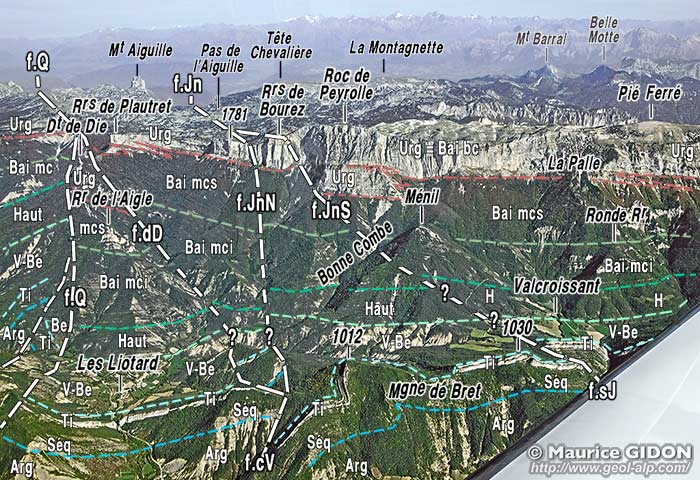 La coupe N-S donnée par le versant ouest de la montagne permet d'examiner comment ces failles se comportent dans les niveaux stratigraphiques inférieurs à ceux du plateau urgonien. On constate d'abord qu'elles se partagent l'une et l'autre en deux branches légérement divergentes vers le SW, ce qui contribue à amoindrir le rejet de chacune, encore que celui de la faille principale de la Queyrie reste important. Les trois autres failles n'occasionnent effectivement pas de rejets importants à la traversée des épaisses alternances marno-calcaires du Barrémien inférieur et de l'Hauterivien ni à leur limite avec les marnes valanginiennes. Enfin lorsque leur tracé atteint le niveau des marnes valanginiennes il ne semble guère se poursuivre au delà : en effet les cassures qui, plus bas, affectent le Jurassique supérieur, en diffèrent assez fortement tant par leur orientation que par leurs sens de rejet. En fait cela indique que ces marnes ont joué en tant que niveau de dysharmonie*, désolidarisant ainsi ces deux familles de failles.