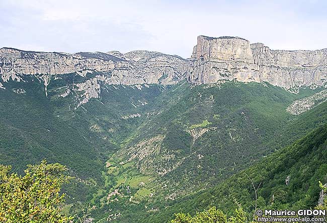 L'éperon que fait vers le sud la montagne de Glandasse proprement dite (voir aussi le cliché de la page Glandage) est dû à ce que l'extrémité méridionale des hauts plateaux du Vercors oriental y est profondément incisée par le cirque d'Archiane. Ce dernier, ouvert vers le sud, est une typique reculée*, en forme de couloir encadré de falaises, qui devient d'ailleurs bifide en amont du village d'Archiane, de part et d'autre du promontoire central du Rocher d'Archiane.