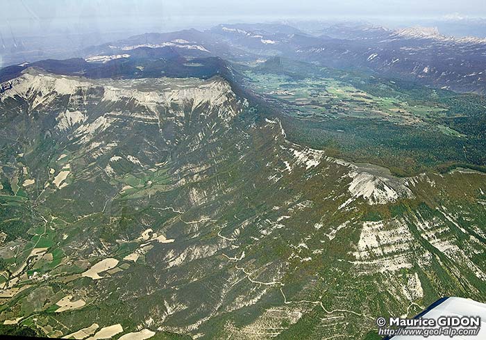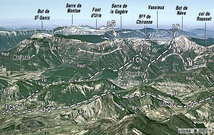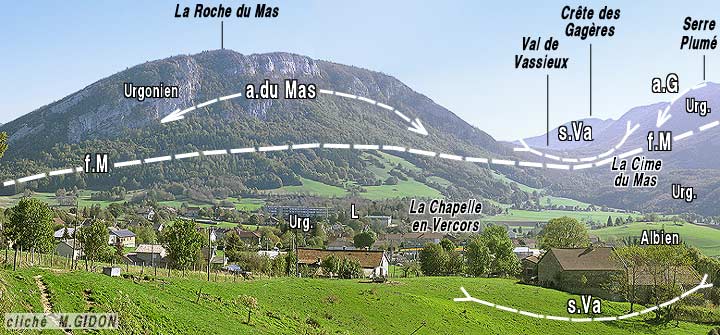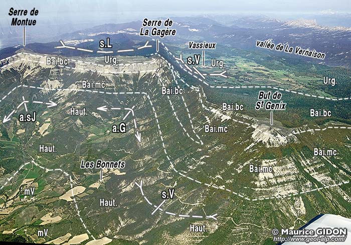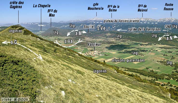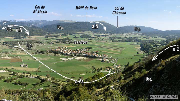 Le Plateau de Vassieux vu du nord-ouest, depuis les abords du col de la Chau (mémorial de la Résistance). a.N = anticlinal de Nève ; s.Va = flexure synclinale de Vassieux ; a.G = anticlinal de la Gagère (retombée orientale seule). Le large fond plat du val n'est pas dû à un rempissage alluvial mais correspond à la dalle urgonienne horizontale qui constitue le fond du synclinal coffré de Vassieux. |