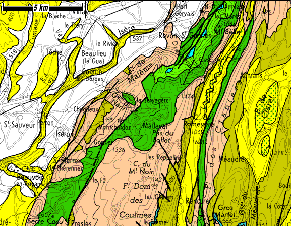 Le tracé de la carte Vif suppose que ce "décrochement du Pas du Follet" se prolongerait vers l'ouest au delà du sommet de La Lunette, ce qui expliquerait le décalage dans le sens dextre la voûte urgonienne de l'anticlinal du Nant au niveau de l'ensellure de Gontier. Mais il s'avère que cela est dû au jeu de la faille de Gontier, qui est en réalité une cassure extensive presque longitudinale par rapport à l'anticlinal du Nant (voir la page "Cognin"). Par ailleurs le tracé intermédiaire du décrochement du Pas du Follet, que la carte indique au sud de Malleval, est une simple supposition car le quaternaire de cette fermeture sud de la dépression de Malleval n'y laisse voir aucun affleurement. |