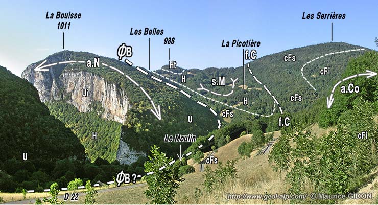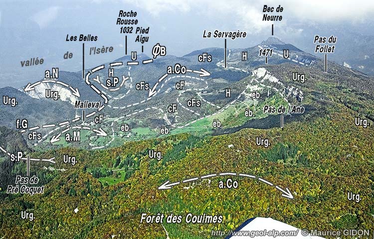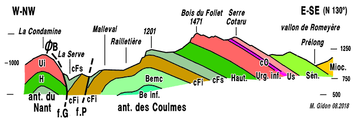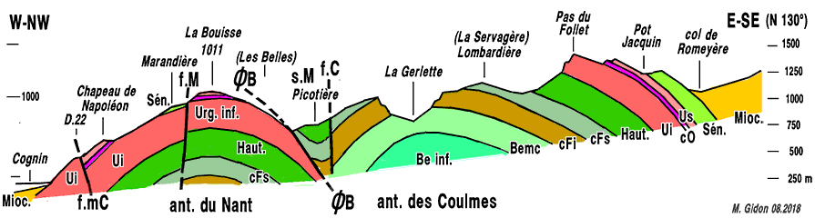 ![]() Coupe transversale aux plis, entre Cognin et le col de Romeyère. f.mC = faille de Mont Chardon ; f.M = faille de Marandière ; ØB = chevauchement des Belles ; s.M = synclinal de Moléron ; f.C = faille des Combes. Cette coupe passe à peu près par la crête fermant la dépression de Malleval du côté septentrional. |