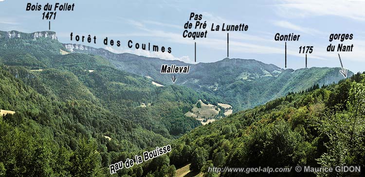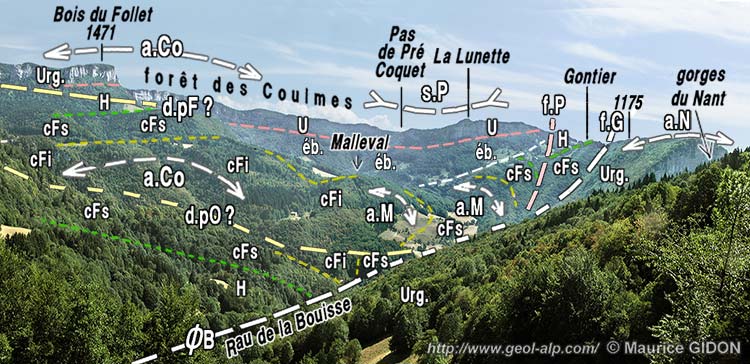 Cette combe est d'ailleurs annulaire car elle se boucle du côté sud en faisant le tour d'un mont dérivé*, de forme molle et surbaissée, qui est armé par les calcaires du Fontanil du coeur de l'anticlinal et qui porte le village de Malleval.