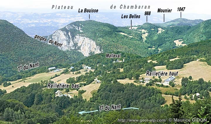 À l'opposé, du côté sud de l'entrée des gorges (voir le cliché plus haut dans cette page), cet accident se prolonge le long du lit du Nant presque jusqu'à la latitude de Malleval. Au delà il se poursuit en se partageant entre deux failles plus redressées, la faille de Gontier et la faille de Presles, qui divergent de bas en haut en rive gauche du Nant : on peut penser que le chevauchement des Belles correspond plus précisément à la faille de Presles, car c'est la plus importante et la plus continue en direction du sud (voir la page "Coulmes"), mais l'option inverse n'est pas exclue.