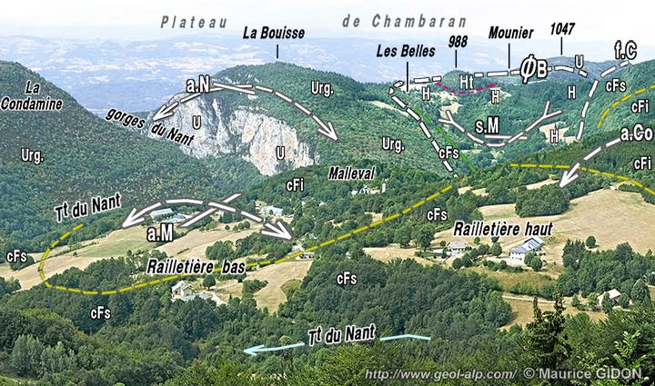 A l'entrée amont des gorges du Nant l'Urgonien du flanc oriental de l'anticlinal du Nant fait place aux calcaires du Fontanil qui affleurent en rive orientale du Ruisseau de La Bouisse. Il y a là une faille que l'on peut l'appeler le chevauchement des Belles car il apparaît, sur l'échine au nord du hameau de ce nom, que l'Urgonien est effectivement chapeauté par des calcaires du Fontanil supportant de l'Hauterivien.