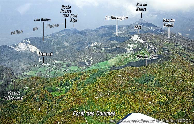 En outre la carte géologique Vif indique que les deux décrochements qui affectent l'Urgonien du flanc oriental de l'anticlinal des Coulmes, celui du Pas de l'Ours au nord et celui du Pas du Follet au sud, se prolongeraient au travers du cœur valanginien de ce pli : cela est peut-être vrai pour le premier, encore que son tracé paraisse peu étayé. Mais c'est certainement erroné pour le second (voir les deux premiers clichés de la page).