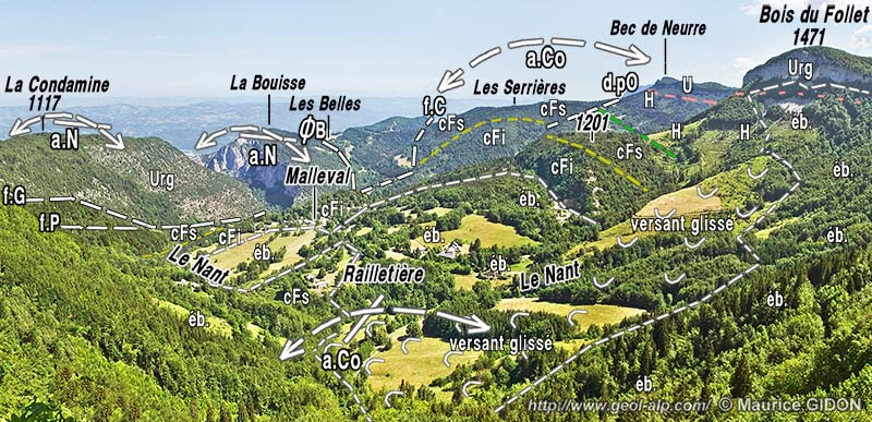 En effet les calcaires du Fontanil inférieurs (massifs) qui affleurent au chef-lieu s'enfoncent vers le sud, au hameau de Railletière, sous les calcaires du Fontanil supérieurs (plus lités). Or cela se passe 200 m en contrebas de l'endroit où le même contact est observable à la voûte du pli principal, à la butte 1201. Malheureusement la couverture ébouleuse qui s'étend sur le replat intermédiaire empêche de voir si ce décalage est dû à une ondulation synclinale ou à une cassure. |