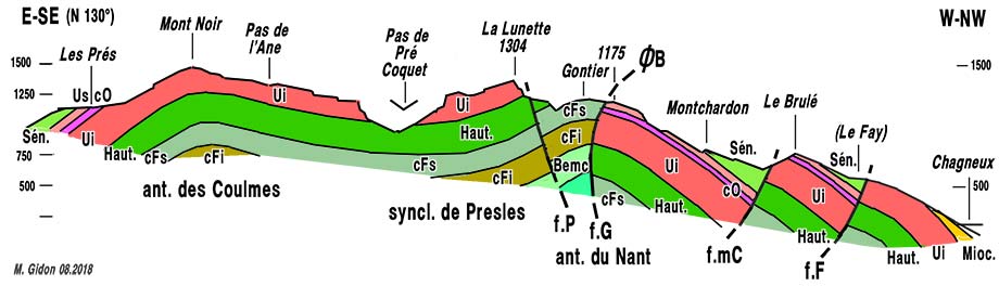Coupe au sud des gorges du Nant, passant par Malleval. ØB = chevauchement des Belles ; f.G = faille de Gontier ; f.P = faille de Presles. |