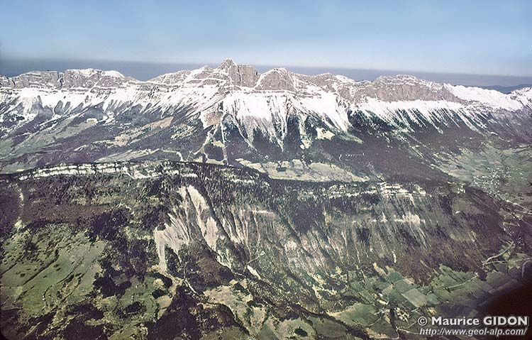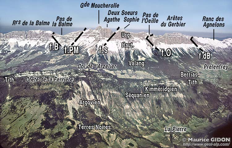 ![]() Le rebord subalpin à la latitude de la Grande Moucherolle vu d'avion, de l'est, depuis l'aplomb de Sinard Le rebord septentrional du cirque de Saint-Andéol est vu d'enfilade : Agathe masque la falaise qui court, sur1 km, entre elle et la Grande Moucherolle. f.B = faille (chevauchement vers l'ouest) de la Balme ; f.PM = faille (E-W, extensive) de la Petite Moucherolle ; f.S = faille (E-W, extensive) des Deux Sœurs , prolongement, en fait, de la précédente ; f.O = faille (N-S, extensive) du Pas de l'Oeille ; f.dB = faille de la Double Brèche. Le redoublement de la barre tithonique, qui caractérise la dépression de la Gresse, débute seulement à gauche des limites du cliché ; celui de l'Éperrimont commence à droite de Prélenfrey : au niveau du Tithonique, la portion du rebord subalpin visible ici ne montre qu'une série stratigraphique continue, exempte de ce genre de complications. |