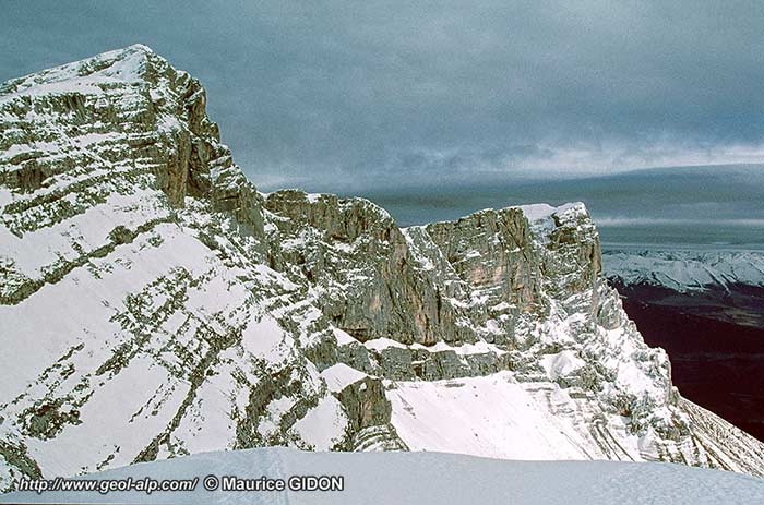 A/ Le versant sud doit son relief de falaises à ce que l'érosion y a tranché la vaste voûte d'un anticlinal de la Moucherolle, très ouvert, dont l'axe s'élève de façon assez accentuée vers le sud. Cette dernière circonstance est à l'origine de ce que leur alignement décrit globalement un arc de cercle ouvert vers le sud (qui ferme du côté nord la dépression de la Gresse). L'analyse attentive de ces abrupts urgoniens révèle en outre des détails tectoniques qui sont moins évidents à observer.