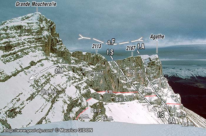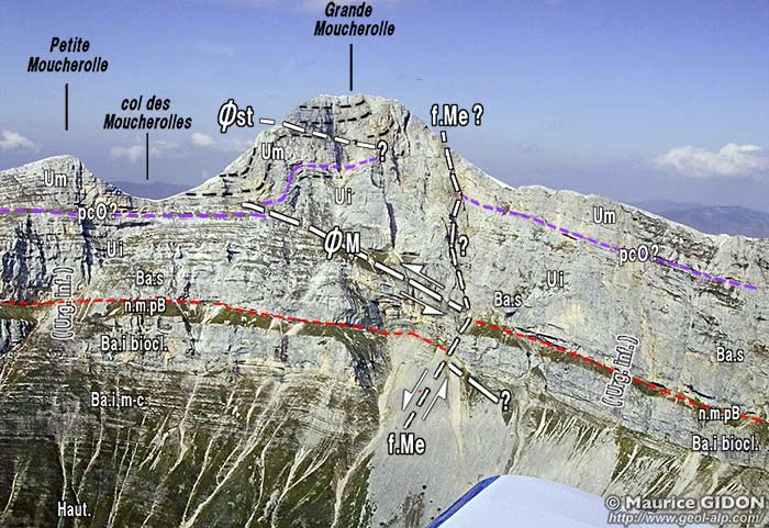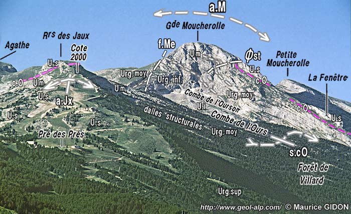 La culmination de la Grande Moucherolle s'avère donc résulter en partie de ces imbrications internes qui, bien que mineures, accroissent là l'épaisseur apparente de l'Urgonien. Mais elle correspond néanmoins fondamentalement à l'extrados supérieur de la large voûte anticlinale qui affecte dans la vallée de la Gresse les couches inférieur à l'Urgonien et qui y a pour cœur le Tithonique de l'anticlinal du Ménil.