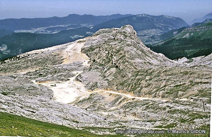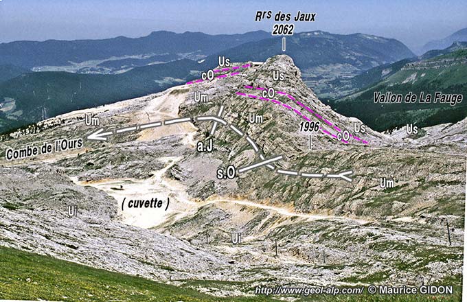 B/ Dans le versant nord de la montagne la dalle urgonienne est le plus souvent érodée en dalles structurales, d'ailleurs à des niveaux variables de ses couches. Elle dessine alors, de plus en plus clairement vers le nord, une demi-voûte anticlinale qui est limitée à l'est par une flexure anticlinale presque anguleuse, l'anticlinal des Jaux, qui ne se manifeste aucunement dans les abrupts méridionaux de la montagne : ce pli, presque N-S, y prend en effet naissance au collet sud (1996) de la crête des Jaux et prend plus d'ampleur vers le nord tout en plongeant dans cette direction (en même temps que le synclinal de la Fauge qui lui fait suite à l'est : voir la page "La Fauge").