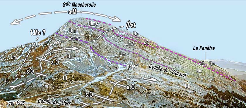 Ø = chevauchement passant sous le sommet de la Moucherolle ; a.M = anticlinal majeur de la Moucherolle ; s.F = synclinal