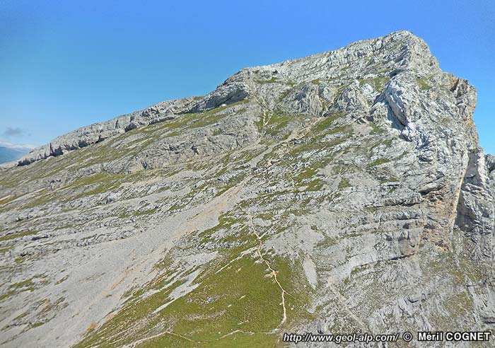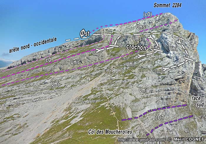 Le chevauchement supérieur se perd vers le NW "dans le ciel" mais la coupe oblique qu'en donne la facette d'accès au sommet (à regard ouest) montre qu'il nait du coté sud-oriental par rupture d'un crochon synclinal dont l'axe est orienté sensiblement N-S.