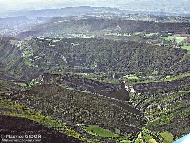 Les gorges d'Omblèze vues de l'est, d'avion, depuis l'aplomb du col de Pierre Rouge.
