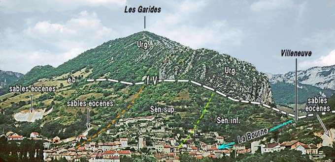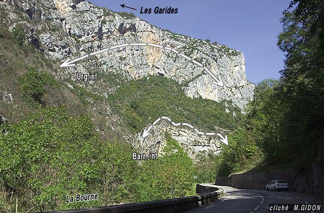 Par sa situation à la bordure occidentale du Vercors cet anticlinal des Garides semble représenter le simple prolongement méridional de l'anticlinal du Nant, qui affecte cette bordure plus au nord (voir la page "Chérennes"). Toutefois il présente par rapport à lui des différences très notables, en même temps que limitées au secteur des gorges (c'est-à-dire sur moins de 2 km en extension N-S) où ce pli est tranché en biais, selon une direction NNW-SSE par les deux failles du Pont Rouillard, qui passent à l'entrée amont de la cluse de la Bourne.