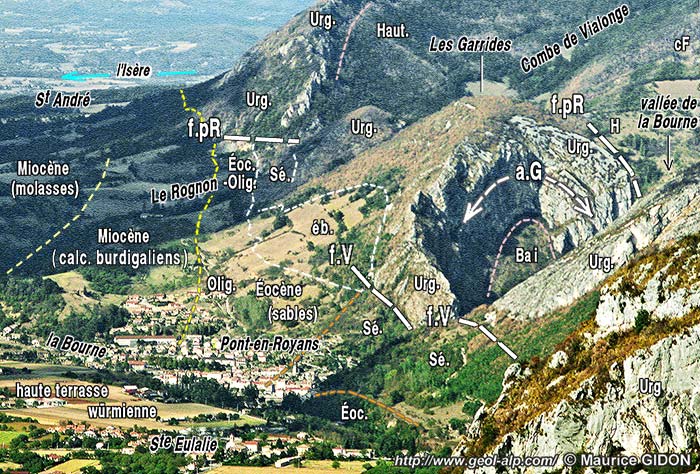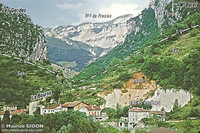 ![]() Les faubourgs méridionaux de Pont-en-Royans vus du sud-ouest, depuis la route de Sainte Eulalie (rive gauche de la Bourne). observer l'ancienne carrière dans les sables réfractaires blancs. f.V = faille de Villeneuve . |