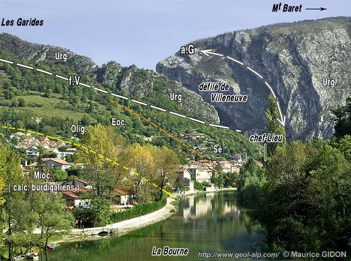 Avant de traverser cet ample domaine synclinal à cœur d'affleurements tertiaires le cours de la Bourne s'échappe du Vercors en perçant la barrière constituée par les couches d'âge secondaire du flanc oriental de ce synclinal du Royans.