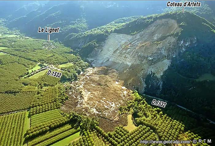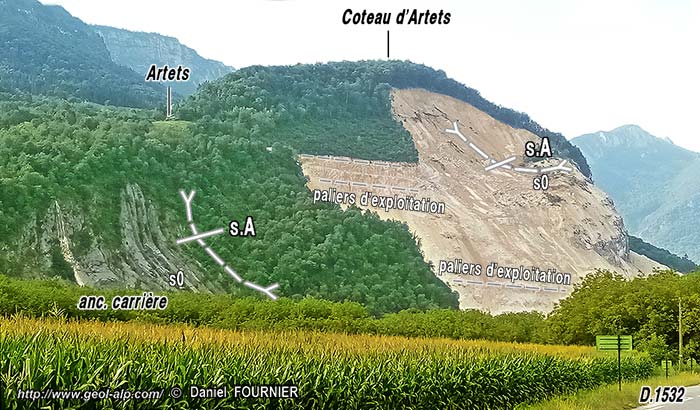 Quoi qu'il en soit ce flanc de pli se rebrousse là vers le haut presque jusqu'à devenir vertical par l'effet d'une flexure synclinale d'Artets dont l'origine est probablement une torsion en crochon de la lèvre occidentale de la faille de Voreppe. On peut penser que c'est le fait de n'avoir pas pris ce détail structural en considération qui a fondamentalement été la cause de l'effondrement du front de taille qui s'est produit le 25 juillet 2024 et a recouvert la route D.1532 sur plusieurs centaines de mètres.