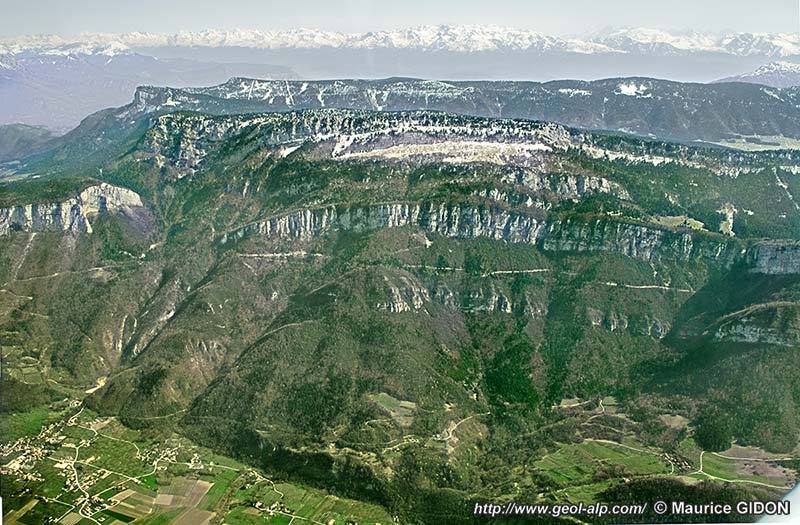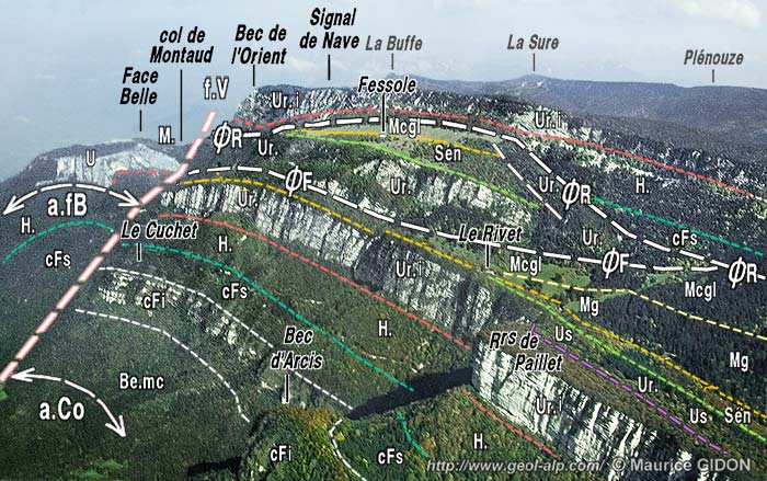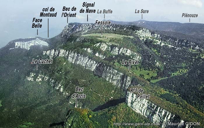 Dans cette succession de son flanc oriental il s'individualise d'abord en contrebas une falaise basse, moins massive et moins continue (car partiellement garnie de bois), qui est celle des calcaires du Fontanil moyens, les plus massifs. La succession de ces couches de ce niveau y est très proche plus de celle qu'on leur connaît en Chartreuse occidentale, aux abords de la localité type du Fontanil (elle diffère par contre de celle, moins épaisse, des abords de Grenoble).