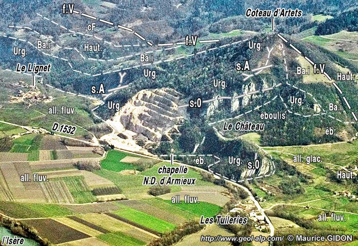 Les derniers affleurements vers le sud de la lèvre occidentale de cet accident, avant qu'il se perde sous les alluvions, sont ceux du Coteau d'Artets. Cette bosse boisée est constituée d'Urgonien dont les couches sont inclinées vers la vallée de l'Isère avec un pendage relativement fort qui d'autant mieux visible qu'elles y sont entaillées une très disgracieuse carrière. Du fait que ce pendage s'atténue vers le bas on peut interpréter cette disposition comme le flanc oriental, très redressé, d'un synclinal dont l'Urgonien du flanc ouest est enlevé ici par l'érosion de la vallée de l'Isère. Il est très probable que ce pli soit le prolongement, décalé par la faille de Voreppe, du synclinal de Moléron qui se dessine dans la lèvre orientale de cette dernière (voir le premier cliché de la présente page) : le rejet coulissant dextre explique aisément que du côté ouest de la faille il affecte des couches de niveau stratigraphique supérieur (Urgonien au lieu de calcaires du Fontanil).