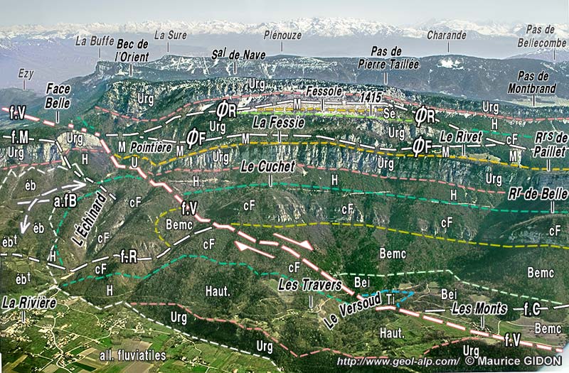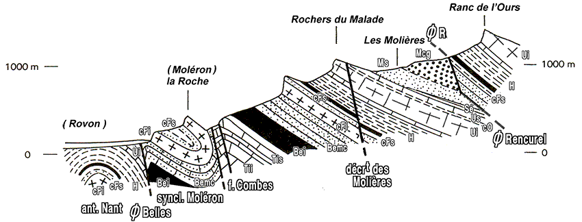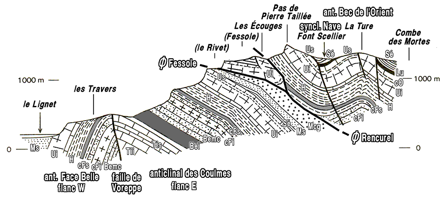Coupe W-E du rebord occidental du Vercors, orientée N.120° et passant 3 km au sud du Bec de l'Orient, entre les chalets de Fessole et du Rivet (extrait très retouché de la notice de la Carte géologique Grenoble à 1/50.000°). |