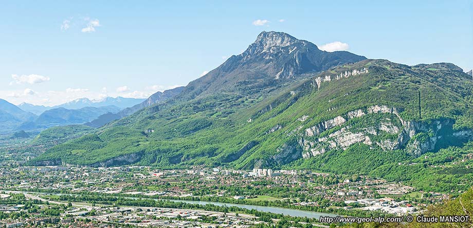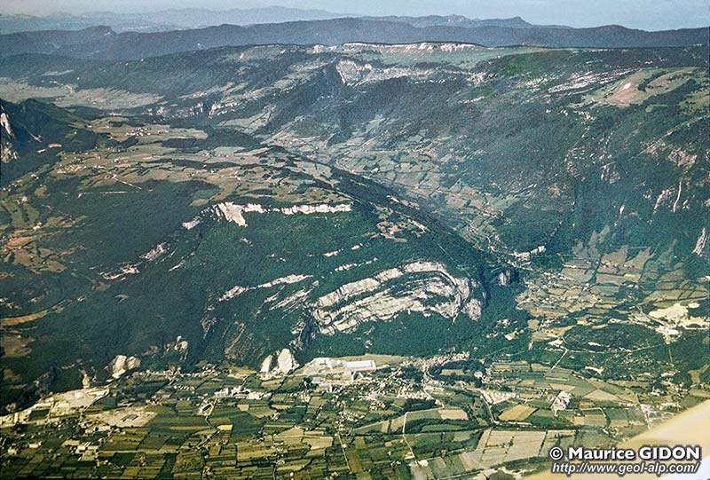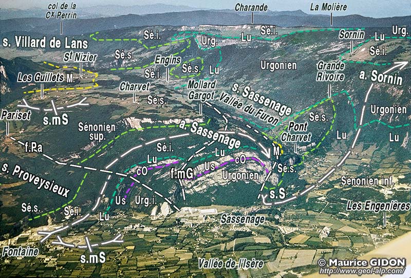 C/ Les pentes de rive gauche de la vallée du Furon, qui s'élèvent vers Sornin et la Dent du Loup montrent, à peu près à mi-hauteur, une inflexion qui les redresse fortement. Si cette inflexion est relativement atténuée au sud d'Engins elle s'accentue au contraire vers le nord au débouché de la vallée du Furon. De ce fait le dessin des couches qui est à l'origine de ce trait de relief est particulièrement bien mis en évidence par la coupe naturelle de la trouée de l'Isère.