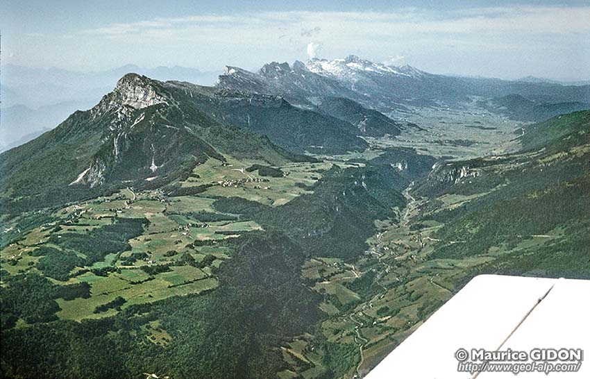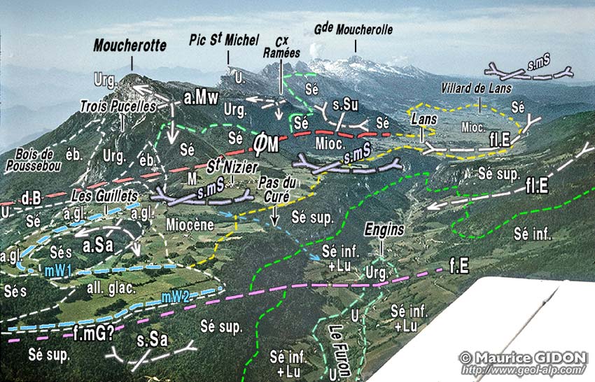 ![]() L'ensemble du val de Lans vu d'avion, du nord, depuis l'aplomb des Engenières de Sassenage. a.Mw = charnière occidentale de l'anticlinal du Moucherotte ; s.Su = synclinal des Suifs ; d.B = décrochement des Bruziers ; ØM = chevauchement du Moucherotte (se raccordant au précédent) ; s.Sa = synclinal de Sassenage ; f.mG? = extrémité occidentale présumée de la faille du Mollard Gargot ; f.E = faille d'Engins (prolongeant de la précédente ?). Au sud de Saint-Nizier on ne distingue plus qu'un seul grand "synclinal de Villard de Lans", dont le flanc ouest est constitué par la flexure des Engenières (fl.E), vue d'enfilade dans la moitié droite du champ de la photo. Le plancher du val de Lans est disséqué, en avant de Lans, par la vallée du Furon (Engins). Celle-ci perce la carapace du Sénonien supérieur et ouvre, jusque très en aval d'Engins, une combe monoclinale dans le Sénonien inférieur du fond (à faible pendage vers la gauche) de la partie occidentale du synclinal de Villard de Lans. Alluvions glaciaires wurmiennes (en bleu clair) : mW1 = moraine des Guillets (1° stade de retrait) ; mW2 = moraine des Charvets (2° stade de retrait). Le tracé de ces moraines, au flanc de la vallée du Furon, indique qu'une langue glaciaire s'engageait dans cette vallée ; tirets bleus fléchés = écoulements d'eaux de fonte. |