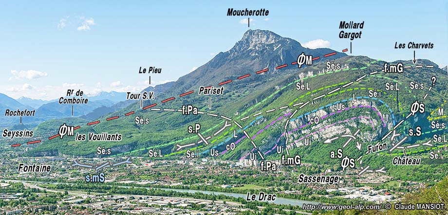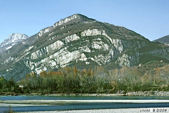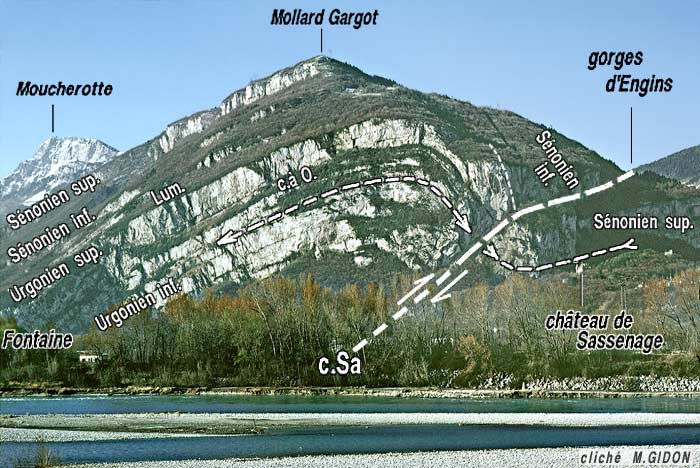 A/ L'agglomération de Sassenage elle-même est dominée par une imposante falaise où les couches dessinent un pli spectaculaire dont l'image a été diffusée par bien des manuels (y compris dans ceux de l'enseignement secondaire). Contrairement à ce qui a souvent été dit et écrit ce pli n'est aucunement un exemple de pli-faille*, car la faille qui rompt les couches de son flanc ouest ne détermine aucun retournement ni étirement des couches en bordure de ses lèvres : celles-ci sont au contraire tranchées net, presque orthogonalement aux strates.