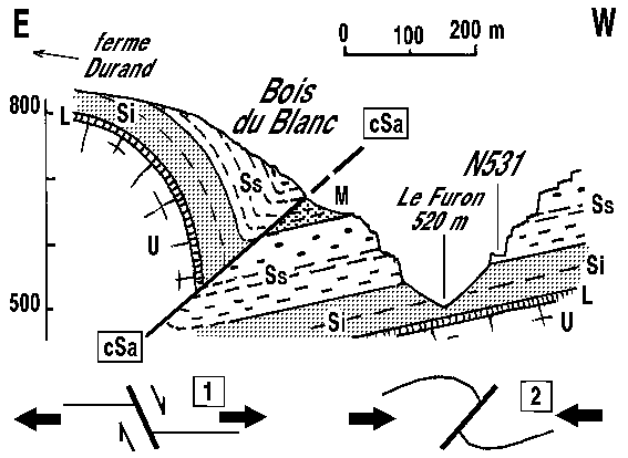 ![]() Coupe en rive droite du Furon, en amont du Pont Charvet (et du monument à la Résistance). Les schémas en pied de figure indiquent les deux étapes de déformation envisagées : la faille est supposée antérieure au plissement puis avoir été basculée par ce dernier. |