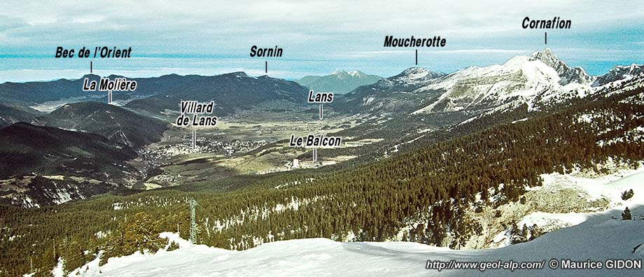B/ Du côté oriental le val de Lans est bordé par des reliefs de Sénonien puis d'Urgonien qui appartiennent fondamentalement au crêt à regard est des arêtes du Cornafion et du col Vert, lequel surplombe de l'autre côté le sillon subalpin de la vallée du Drac (voir les pages "La Fauge" et "Cornafion").