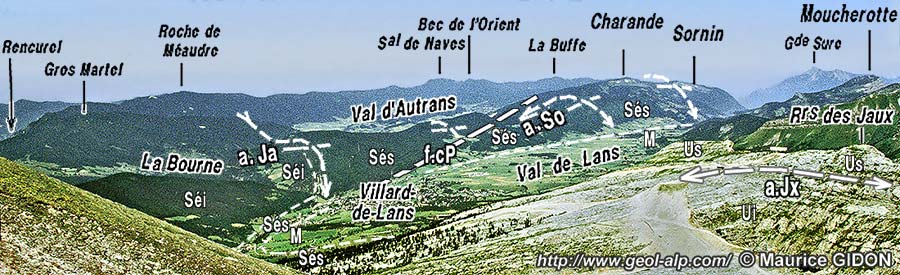 ![]() Corrençon et les crêtes du Vercors oriental vus du sud-ouest, d'avion, depuis l'aplomb du sommet de la Sambue. f.A = faille de L'Arc ; ØCr = chevauchement des Crocs ; f.Cl = faille des Clots, à lèvre nord-ouest abaissée ; s.C = charnière de renversement du Cornafion ; s.F = synclinal de la Fauge (son val est masqué par la crête de la Côte 2000) ; a.Jx = anticlinal des Jaux (ant. nord de La Moucherolle) ; s.vL = synclinal de Villard de Lans : son axe plonge ici assez nettement vers le nord (vers la gauche) ; f.Cb = faille du Clot de la Balme. (commentaires plus détaillés du fond de paysage aux pages "col de l'Arc", "Cornafion" et "La Fauge") |