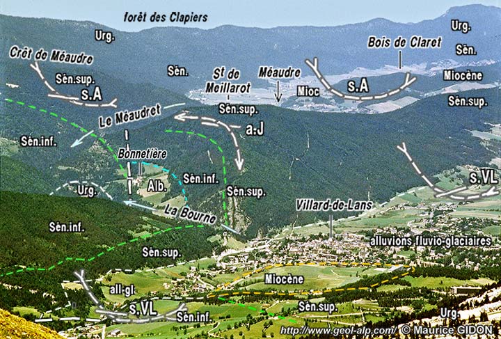 A/ À l'ouest de Villard-de-Lans le flanc ouest du synclinal est caractérisé par l'accroissement vers le bas du pendage des couches de Sénonien supérieur : ce trait est l'expression du style "coffré" de ce large pli. Au nord de Villard-de-Lans ce flanc occidental est en outre affecté par une cassure qui le coupe en biseau aigu et disparaît vers le sud sous les alluvions quaternaires du fond du val : elle y sépare en deux la charnière anticlinale de l'anticlinal de Sornin, vraisemblablement par un jeu coulissant de décalage dextre.
