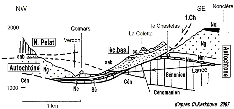 f.Ch = faille du Chastelas ; Ng = Grès d'Annot ; sab = "schistes à blocs" de la semelle de la nappe du Pelat.