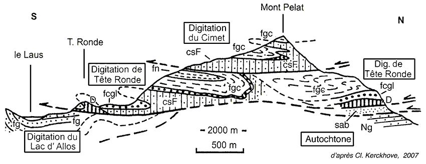 écailles imbriquées de la nappe du Pelat : d.3E = digitation des Trois évéchés ; d.cB = digitation du Cheval de Bois ; d.Ci = digitation du Cimet ; d.tR = digitation de la Rour Ronde ; d.lA = digitation du Lac d'Allos.