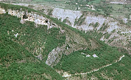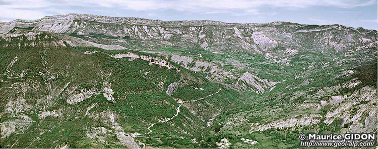 vue peu oblique à l'axe du pli (partie centrale du cliché ci-dessus). Le plongement vers le sud-est de l'axe du plisu se voit particulièrement bien dans les pentes que traverse la route de Chaudon, car les calcaires à silex du Carixien y sont dégagés en dalle structurale à la charnière de l'anticlinal, avant d'être percés par un petit ravin orienté NW-SE. |