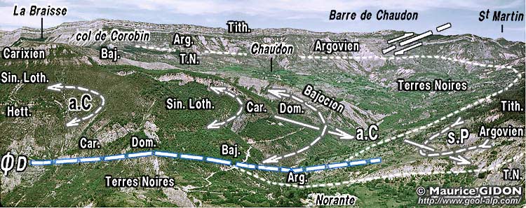 La combe de Chaudon se termine environ deux kilomètres au sud de cette localité en dessinant une sorte d'amphithéatre qui est ouvert en direction de l'ouest. Cette fermeture est due à ce que la disposition monoclinale presque N-S des couches y fait place à un dispositif plissé d'axe presque orthogonal à leur direction au nord de Chaudon. Entre Norante et Barrême il comporte deux
