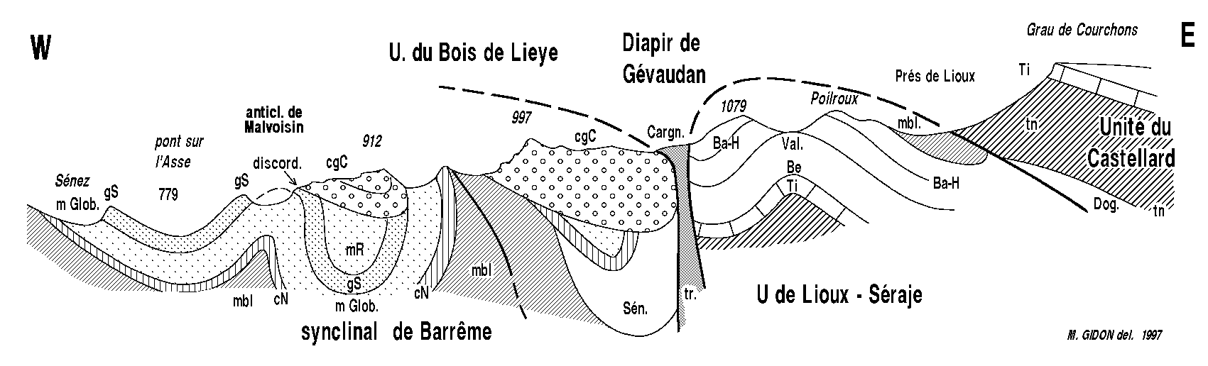 La bande triasique occidentale, par ses caractères de lame verticale représente de toute évidence l'émanation méridionale du diapir de Gévaudan : l'emplacement où ce dernier s'est mis en place (sans doute à l'Oligocène) correspond au point de rencontre d'une cassure à peu près N-S (le décrochement de Lambruisse) et du coeur triasique d'un anticlinal NW-SE (celui du Castellard), auquel faisait suite vers le sud le synclinal de Lioux (unité de la Sérage). Ce sont vraisemblablement les compressions ultérieures, contemporaines du charriage de la nappe de Digne, qui sont responsables du rétrécissement (par écrasement NE-SW) de ces bandes triasiques.