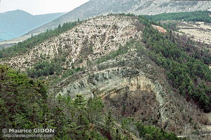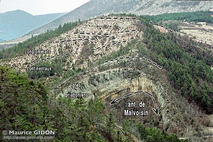 À l'est du village les couches du Tertiaire (dont on ne voit plus le soubassement crétacé) décrivent plusieurs plis mineurs, relativement fermés, dont l'un au moins (celui qui forme la butte de Malvoisin) s'avère avoir fonctionné pendant le cours même de la sédimentation oligocène (comme ceux de Clumanc et de l'Asse de Moriez).