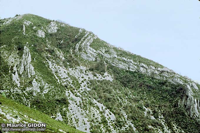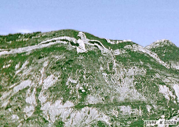 2- La barre tithonique est tordue par des plis mineurs, qui se développent uniquement au voisinage de la faille. Bien que leur axe soit orienté comme le plan de faille ce ne sont pas des crochons* car le sens de torsion n'est pas en accord avec celui du rejet : ils traduisent le froissement du banc, sous l'effet de la résistance que finit par rencontrer son emboutissement, et rentrent dans le cadre de ce que l'on désigne du nom de "plis d'ancrage".