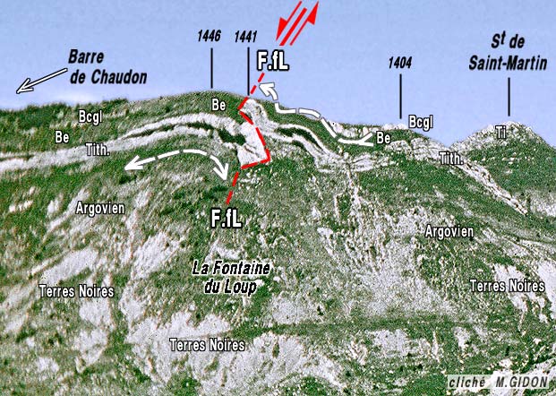 F.fL = faille de la Fontaine du Loup : il s'agit d'une faille originellement extensive (compartiment de gauche abaissé) qui a été déformée par le serrage dû au plissement. En effet :