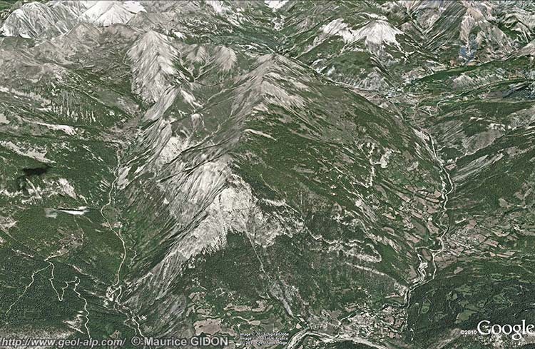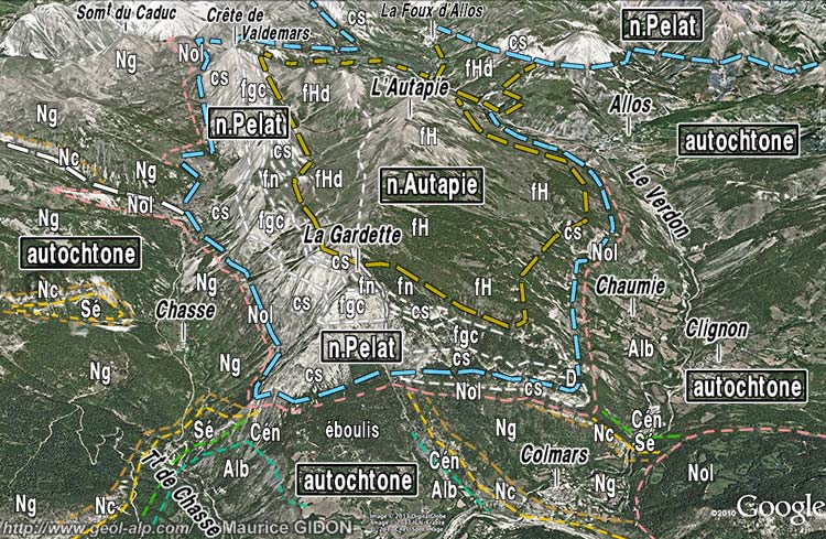 Il est à remarquer que si la nappe inférieure (du Pelat) repose du côté ouest sur les Grès d'Annot du sommet de la succession autochtone, du côté est, par contre, elle recouvre les couches du Crétacé "moyen" de la demi-fenêtre d'Allos. C'est-à-dire qu'il y a eu, avant le charriage, une ablation de toute la dalle du Sénonien - Nummulitique : on se trouve donc là à l'extrémité méridionale de la zone de dénudation du soubassement des nappes (voir la page consacrée à ce sujet). |