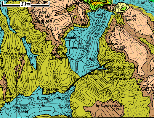 redessinée sur la base de la carte géologique d'ensemble des Alpes occidentales, du Léman à Digne, au 1/250.000°", par M.Gidon (1977), publication n° 074 |