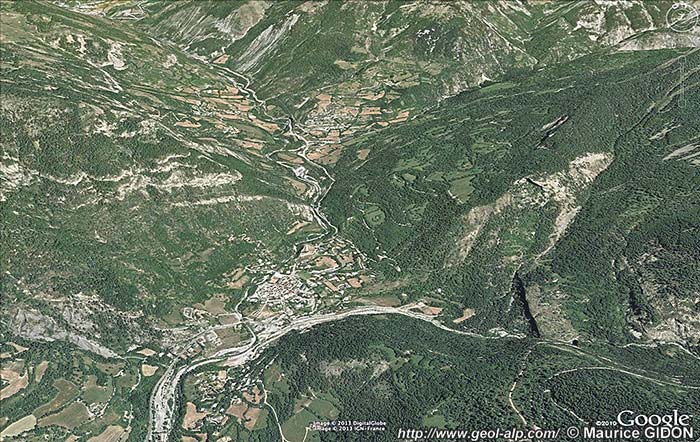 Par contre il disparaît en rive droite car il y est masqué sous la klippe des nappes de la montagne de l'Autapie : on est là, en effet à l'extrême pointe méridionale de l'extension des affleurements des nappes de l'Embrunais - Ubaye.