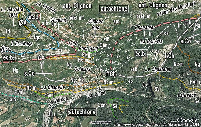 ![]() Coupe de détaillée, transversale à la vallée du Verdon, à la hauteur de Colmars (d'après une figure inédite obligeamment communiquée par Mr. Cl. Kerckhove). f.Ch = faille du Chastelas ; Ng = Grès d'Annot ; sab = schistes à blocs* affleurant en semelle sous la nappe du Pelat. |