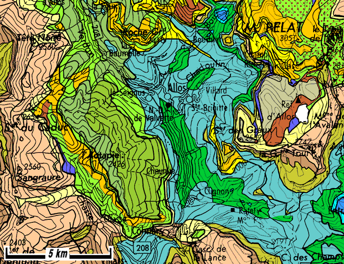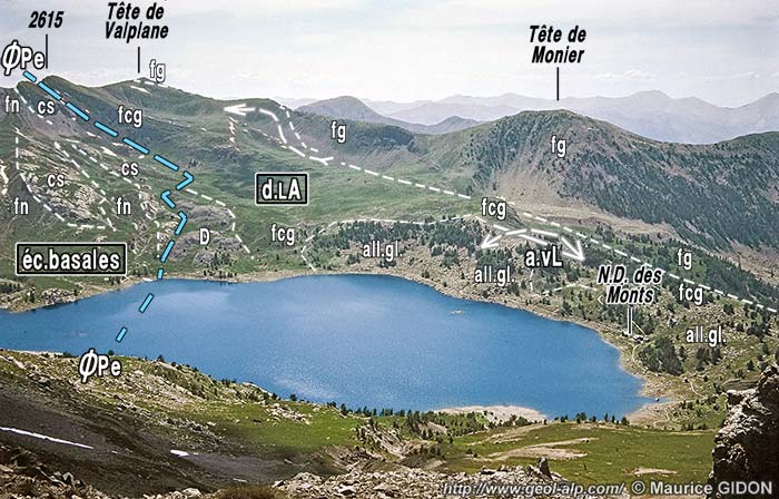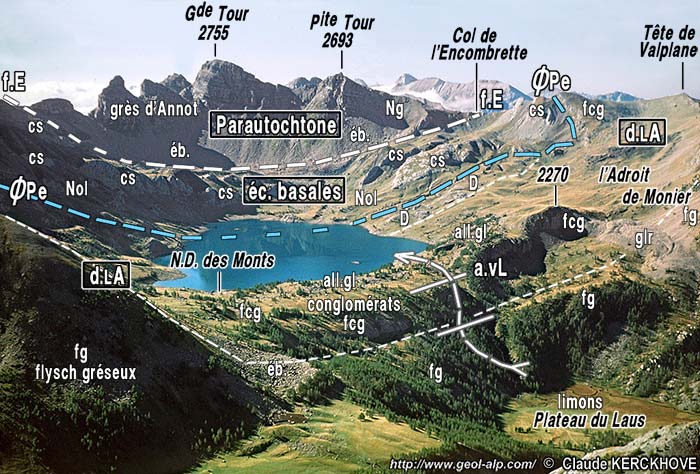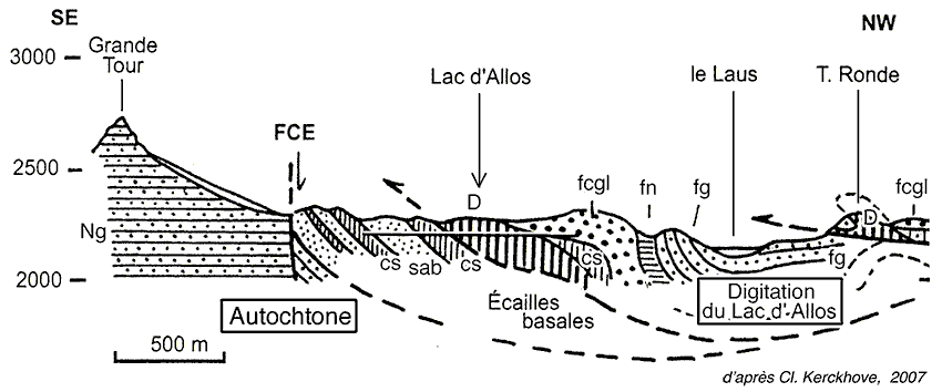 ![]() Coupe de la cuvette du Lac d'Allos (d'après une figure inédite obligeamment communiquée par Cl. Kerckhove). "sab" = "schistes à blocs" (olistostrome nummulitique) ; "fcgl" = conglomérats (bartoniens) |