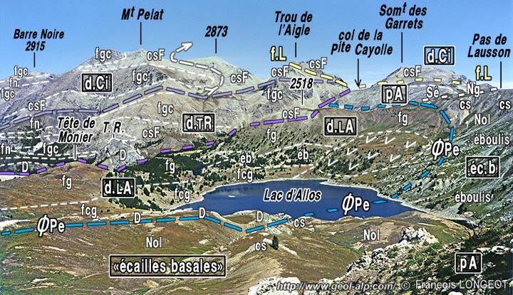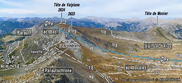 Au pied des abrupts des Tours et dans les abrupts du versant sud de la Tête de Rocheplane, la digitation du Lac d'Allos s'avère reposer sur un matelas de schistes argileux qui est épais d'une centaine de mètres et qui est riche en intercalations lenticulaires de calcschistes néo-crétacés. Cet ensemble (désigné localement du nom d'"écailles basales") représente vraisemblablement la formation olistolitique connue presque partout au sommet de la succession nummulitique.