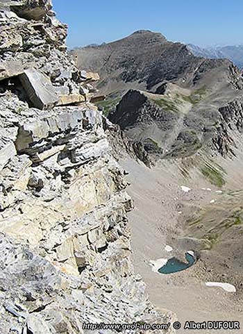 Les rochers sommitaux du Pelat (en arrière-plan le sommet du Cimet et les lacs de la Grande Cayolle). (cliché original obligeamment communiqué par Mr. A. Dufour). La falaise montre les alternances de calcschistes et de plaques de calcaires gréseux (épaisses de 10 à 30 cm), qui sont typiques du flysch néocrétacé du Bachelard. |